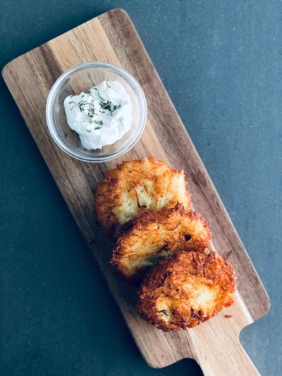 I like to use a small strainer and strain each latke before putting it in the oil. These are great served on a board as seen in the picture.